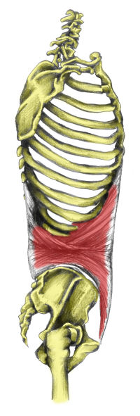 Mięsień poprzeczny brzucha, najgłębszy ze wszystkich mięśni brzucha, leży poniżej kresy ukośnej. Połączony jest z kręgami lędźwiowymi, otacza je i biegnie z powrotem do przodu łącząc się w linii środkowej brzucha. Praca tego mięśnia powoduję podniesienie ciśnienia wewnątrz brzucha, przez co utrzymuje sztywno i stabilnie część lędźwiową kręgosłupa.