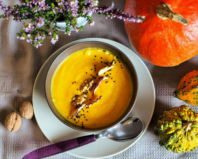 Temperatura na zewnątrz spada coraz niżej. Dla wszystkich zmarzluchów i smakoszy przygotowaliśmy przepis na pyszną, rozgrzewającą zupę dyniową. My podajemy ją z chipsami jabłkowymi i orzechami włoskimi. Mniammm… 🙂