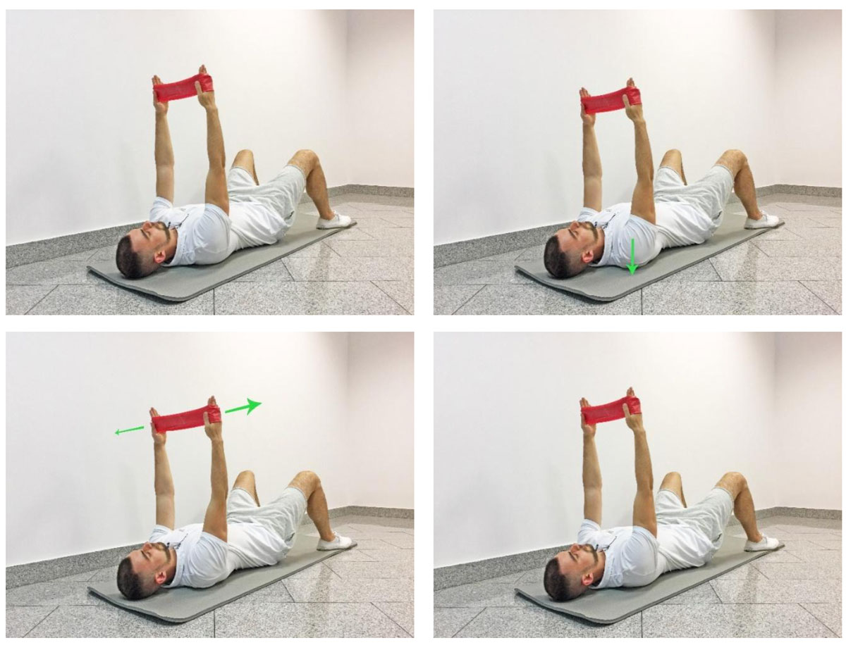 Pozycja wyjściowa: leżenie tyłem z nogami zgiętymi, pomiędzy dłońmi taśma do ćwiczeń, łopatki ściągnięte.