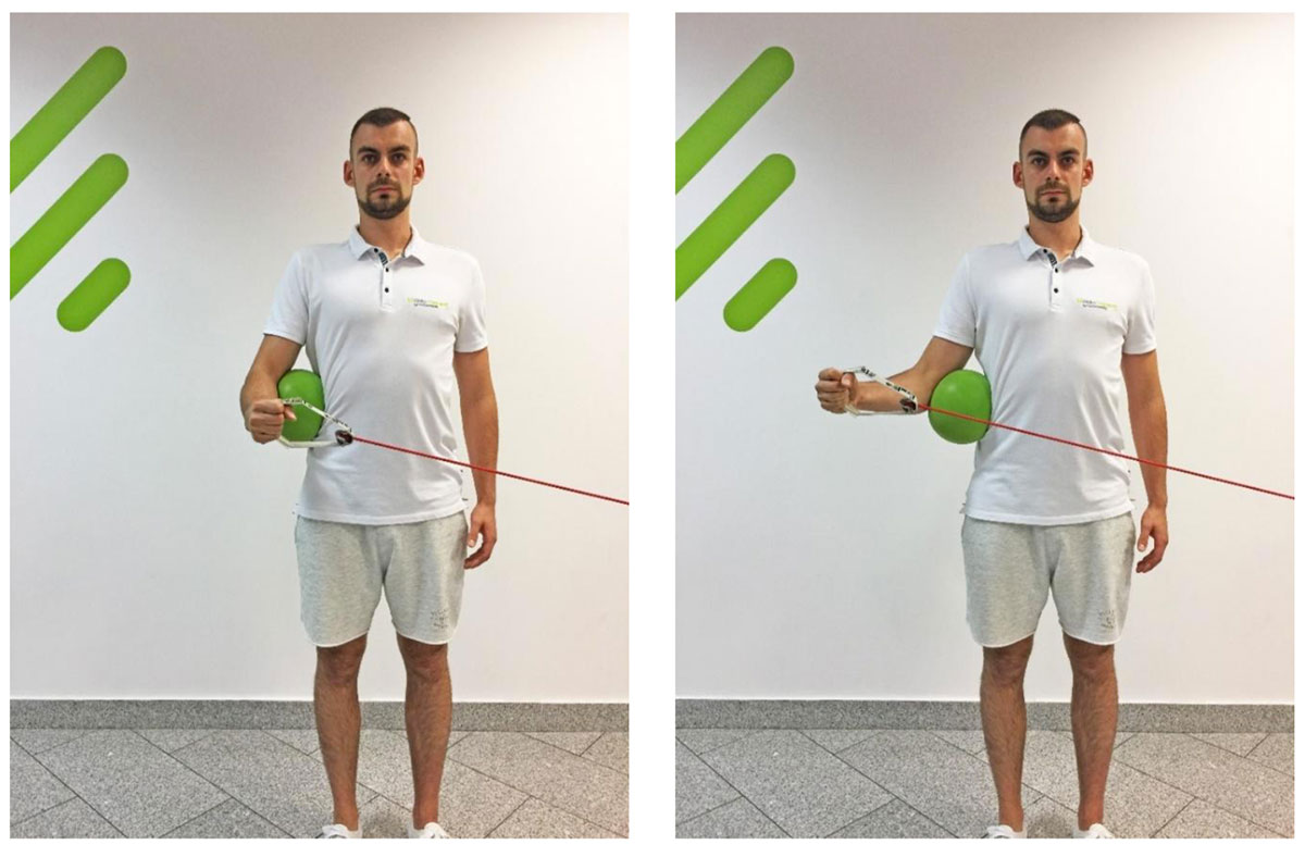 Pozycja wyjściowa: postawa stojąca, łopatki ściągnięte, przedramię ustawione w 90 stopniach zgięcia w stawie łokciowym, pomiędzy łokciem a tułowiem piłka lub zwinięty ręcznik. W dłoni trzymamy taśmę/gumę do ćwiczeń.