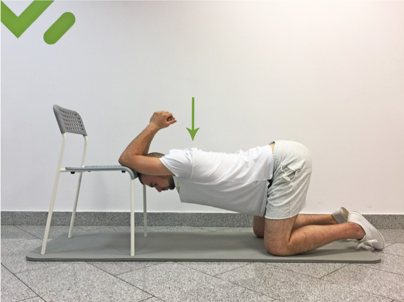 Wykonaj klęk podparty, następnie ułóż ramiona na krześle, złącz dłonie i umieść je nad głową. Swoim tułowiem wykonuj ruch w stronę podłogi.Wytrzymaj 15 sekund i wróć do pozycji początkowej.