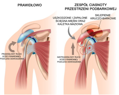 Mianem zespołu cieśni przestrzeni podbarkowej możemy określić stan, w którym podczas ruchów ramienia dochodzi do konfliktu pomiędzy sklepieniem kruczo-barkowym, a guzkiem większym kości ramiennej. Najczęściej ma to miejsce w 1/3 przedniej powierzchni wyrostka barkowego [24]. Pomiędzy guzkiem większym kości ramiennej, a sklepieniem kruczo-barkowym znajduje się kaletka podbarkowa i ścięgna mięśni rotatorów, gdzie ścięgno mięśnia nadgrzebieniowego jest miejscem najbardziej narażonym na uszkodzenia [16]. Powtarzające się mikrourazy powodują zaburzenie funkcji stożka rotatorów, czyli obniżania głowy kości ramiennej, a w następstwie zmniejszenie przestrzeni podbarkowej. Sumujące się mikrourazy w późniejszym czasie powodują odkładanie się złogów wapnia na ścięgnie mięśnia nadgrzebieniowego i tworzenia ostróg na wyrostku barkowym i więzadle kruczo-barkowym, co jest kolejnym czynnikiem zmniejszającym przestrzeń podbarkową [2,9]. Całość zmian powoduje stan zapalny oraz ból. Objawia się to zmniejszeniem ruchomości oraz osłabieniem siły mięśni, zwłaszcza mięśnia nadgrzebieniowego. Jego niewydolność powoduje gorsze przyparcie powierzchni stawowych, a tym samym gorszą stabilizację i mniejszą przestrzeń podbarkową [3]. Kontynuowanie wykonywania czynności z bólem często jest późniejszym powodem trwałego uszkodzenia ścięgien mięśni stożka rotatorów. Zapalenie kaletki podbarkowej jest często pierwszym objawem niepokojących zmian w stawie ramiennym. Skutkiem gojenia procesu zapalnego jest bliznowacenie prowadzące do wzrostu połączeń kolagenowych torebki stawowej i więzadeł. Powoduje to zmniejszenie ruchomości.