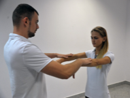 Wykonanie: ruch rotacji wewnętrznej (przedramię w stronę podłoża) do końca zakresu ruchomości, wykonujemy ruch rotacji zewnętrznej (oddalamy przedramię od podłoża) z jednoczesnym oporem stawianym przez drugą dłoń. Napięcie utrzymujemy przez 7-10 sekund, po czym zwiększamy zakres rotacji wewnętrznej do granicy ruchomości i powtarzamy czynność. Ćwiczenie wykonujemy do momentu w którym zakres ruchomości nie będzie się zwiększał. Na zakończenie ćwiczenia zmieniamy ustawienie dłoni która stawiała opór, ustawiamy ją pod dłonią kończyny ćwiczonej i wykonujemy jeden ruch rotacji wewnętrznej o maksymalnej sile, utrzymując napięcie przez 3 sekundy.