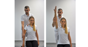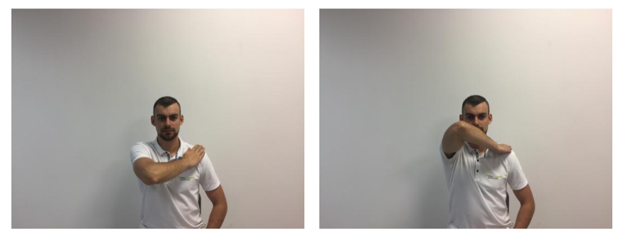- Active impingement test – osoba badana znajduje się w pozycji siedzącej. Swoją dłoń umieszcza na przeciwnym barku, przy ustalonej pozycji stara się unieść łokieć jak najwyżej.
