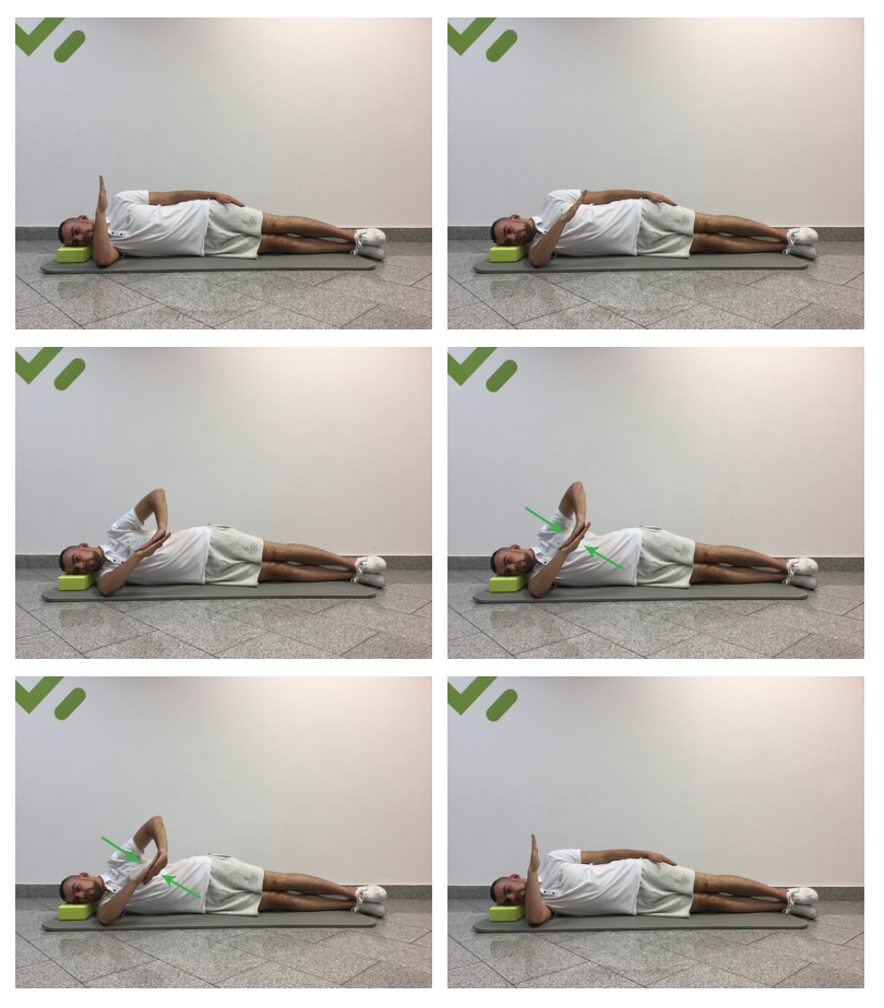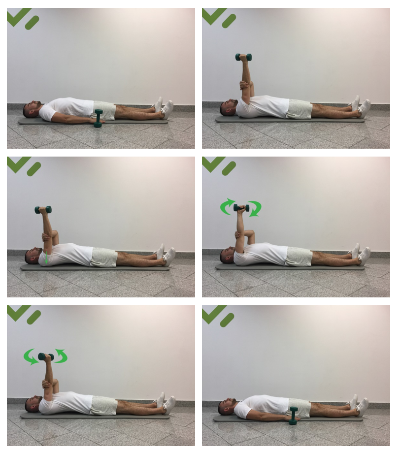 Pozycja wyjściowa: leżenie tyłem, kończyna górna zgięta, w dłoni hantel/kettlebell.. Druga ręka stabilizuje ją trzymając za łokieć, bark po stronie ćwiczonej dociśnięty do podłoża.