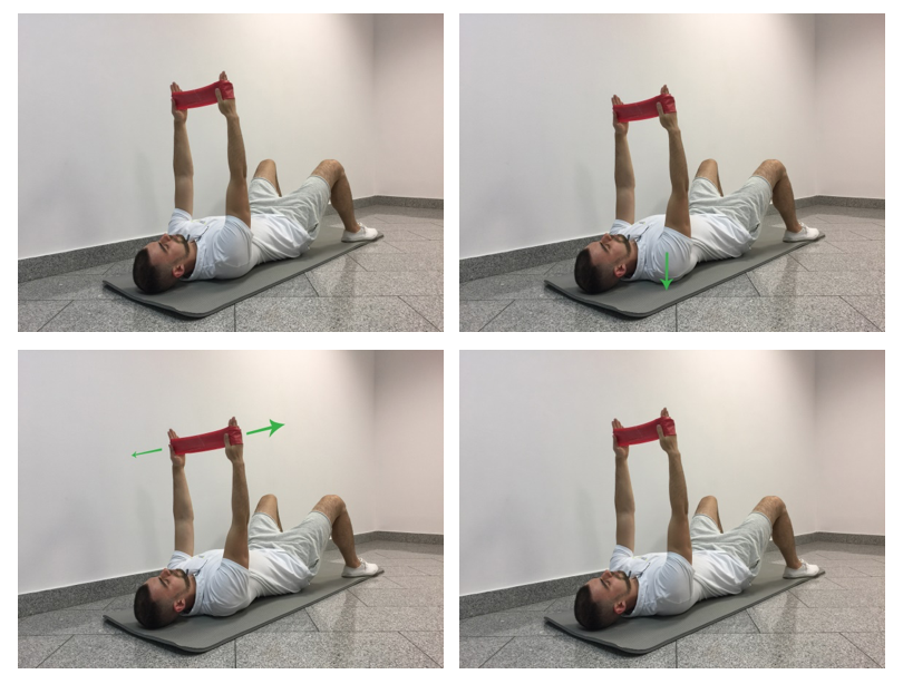Pozycja wyjściowa: leżenie tyłem z nogami ugiętymi w stawie kolanowym oraz biodrowym, pomiędzy dłońmi taśma/guma do ćwiczeń, łopatki ściągnięte.