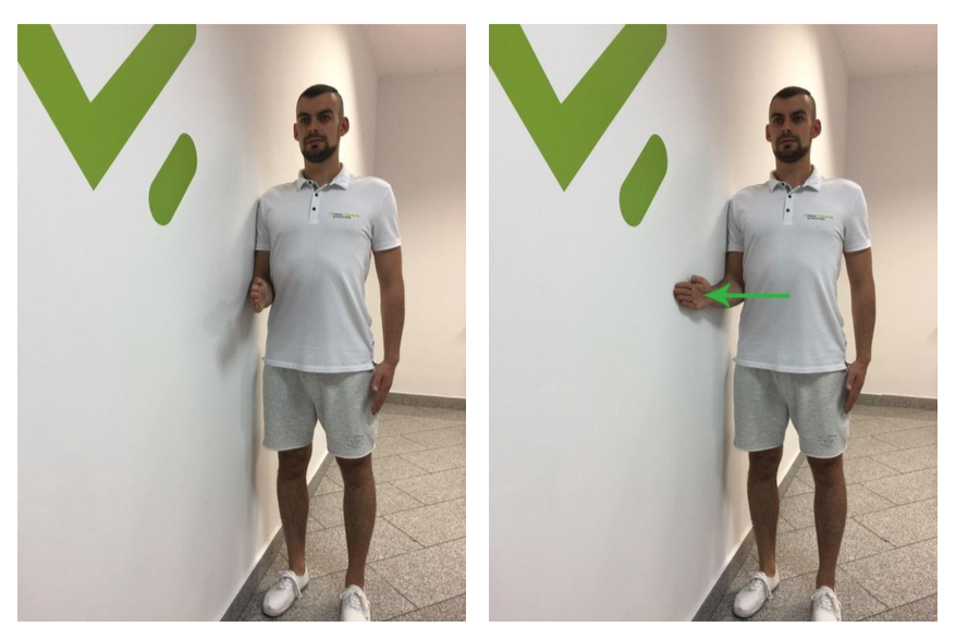 Pozycja wyjściowa: postawa stojąca przy ścianie, tak by bark i łokieć były dociśnięte do ściany, łopatki ściągnięte. Przedramię ustawione w 90 stopniach zgięcia w stawie łokciowym, oddalone od ściany.