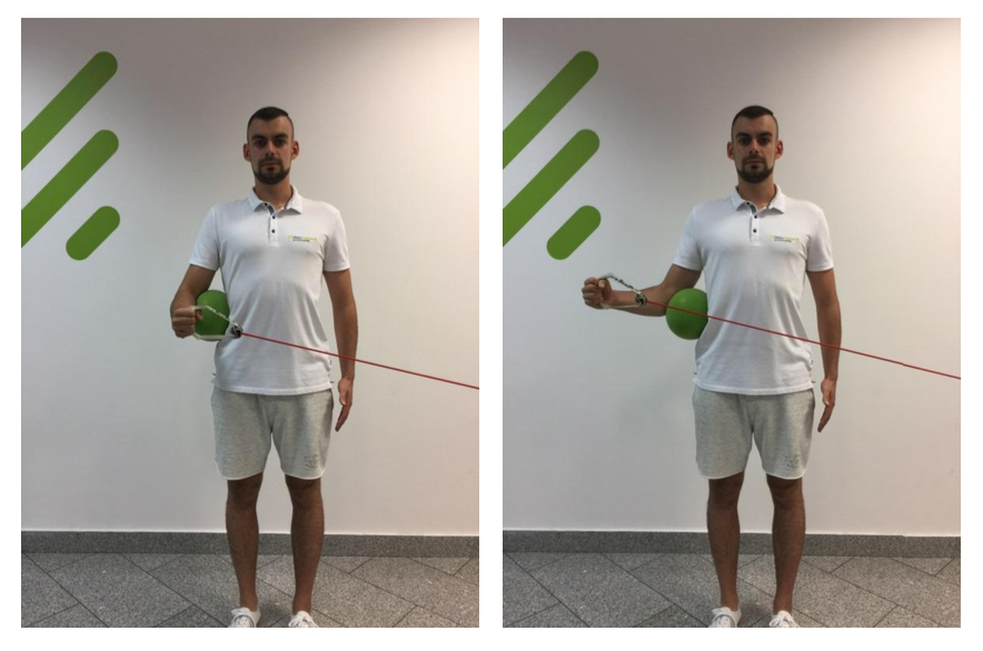Pozycja wyjściowa: postawa stojąca, łopatki ściągnięte, przedramię ustawione w 90 stopniach zgięcia w stawie łokciowym, pomiędzy łokciem a tułowiem piłka lub zwinięty ręcznik (by nie wykonywać dodatkowego ruchu odwodzenia podczas ćwiczenia – nie chcemy wzmacniać mięśnia naramiennego). W dłoni trzymamy taśmę/gumę do ćwiczeń.